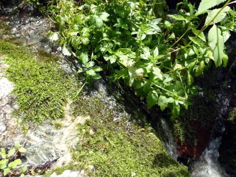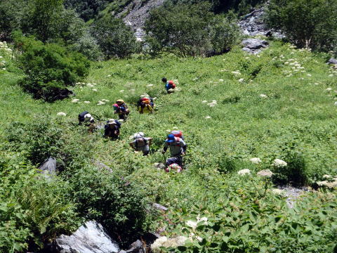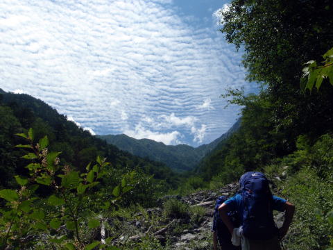 白根御池への道を分けて大樺沢沿いの道を登る。汗がダラダラ流れて石の上に落ちる。右岸に渡ってしばらく、蓄えてた水分も少なくなったようで汗の出が悪くなったところで清冽な水の流れ