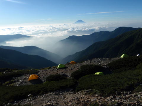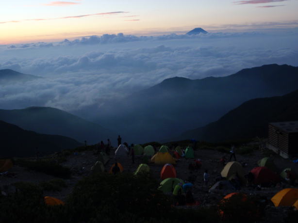 2日目、北岳山荘テント場の朝、雲海に浮かぶ富士