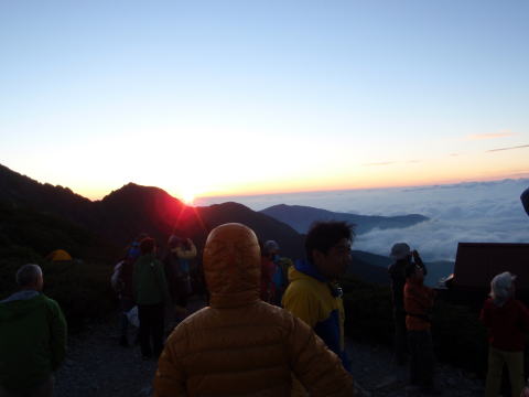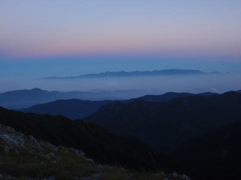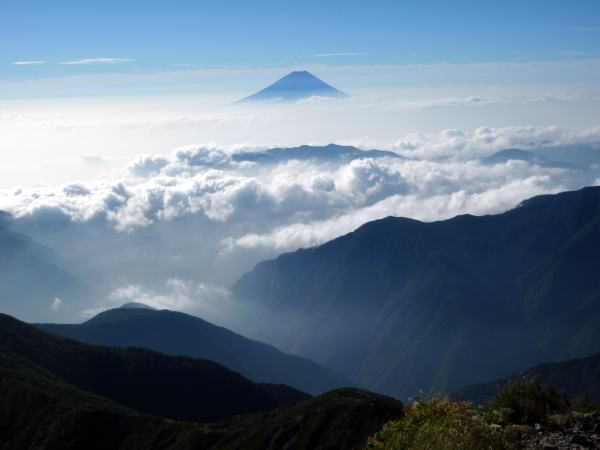 富士山の反対方向の眺め、中央アルプスの峰々も雲海に浮かび上がっていました