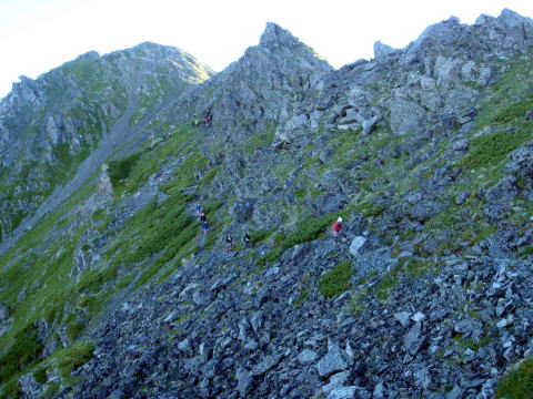 黒光りする北岳の岩壁を仰ぎ見ながら一歩一歩