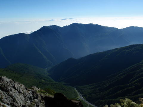 そのずっと向こうに北アルプスの山々が連なって、その左の塊が槍穂高連峰、槍の穂先が見えるって、白馬三山はずっとずっと右奥に見えているよ