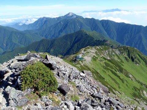 中白根と左奥の間ノ岳、手前鞍部の赤い屋根の北岳山荘
