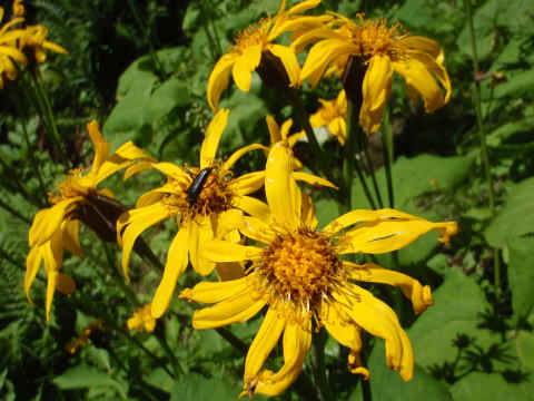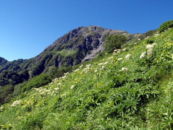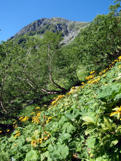 マルバダケブキの群落と北岳、ちょうどこのころバットレスで悲しい事故が起こっていたようです。(帰宅後知りました)