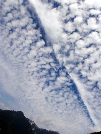 空にはポコポコ羊雲に、何の境か青い筋、飛行機の航跡かな