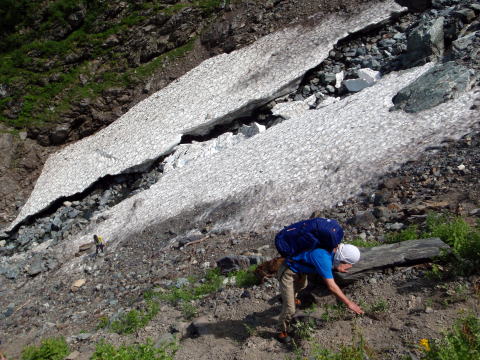 肩ノ小屋に向かう草すべりコースの分岐を過ぎて雪渓の末端でひと休み