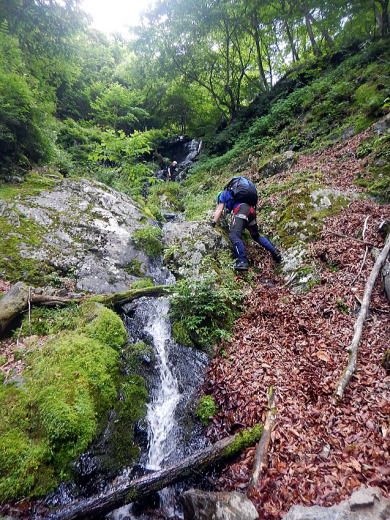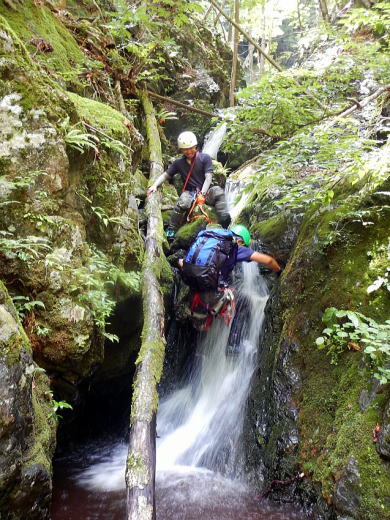 苦労したのが、高巻きでの泥岩壁の登攀、ズルズル滑る足元には体重を乗せられず、立木にぶら下がりながら腕力でずり上がるような場面、ここが核心だったねとみんなで意見が一致