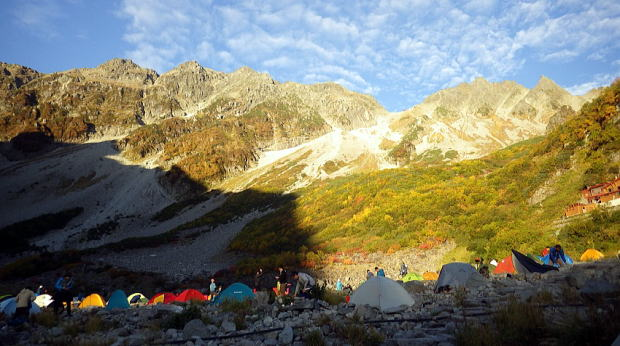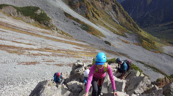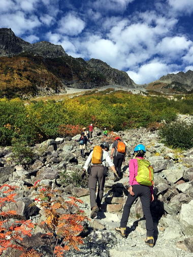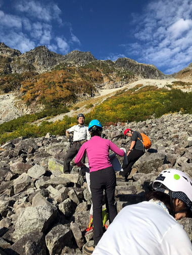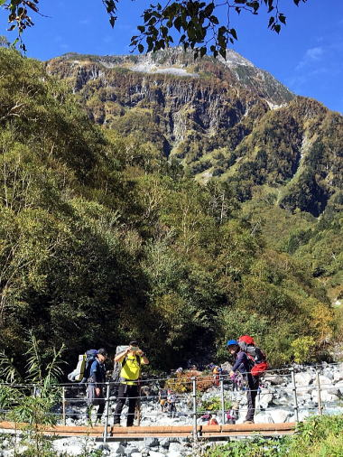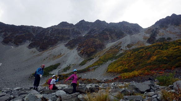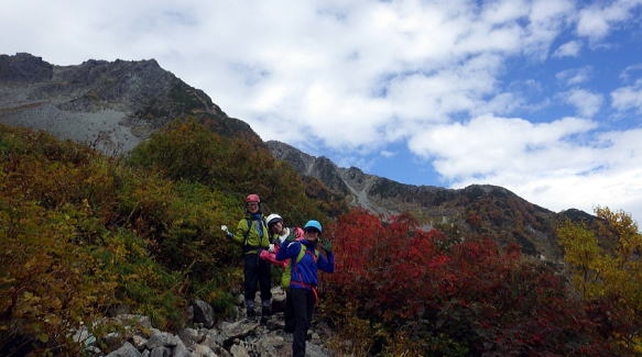 本谷橋を渡ってここからやっと登り坂です。重い荷物がズっしり感じ出した頃でしょうか、病み上がりのリーダー撃沈。荷物を皆で分担してゆっくり進んだお陰で景色をたっぷり堪能しながら歩けました。涸沢辺りの紅葉は色づき始めで初々しい色合いでした。