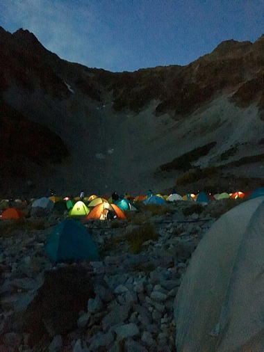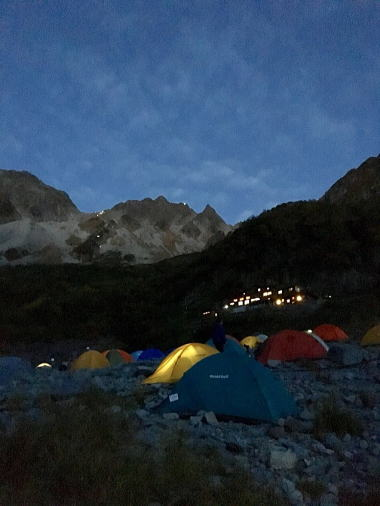 涸沢名物の色とりどりのテント場は夜になると宝石を散りばめたような輝きで素敵でした。