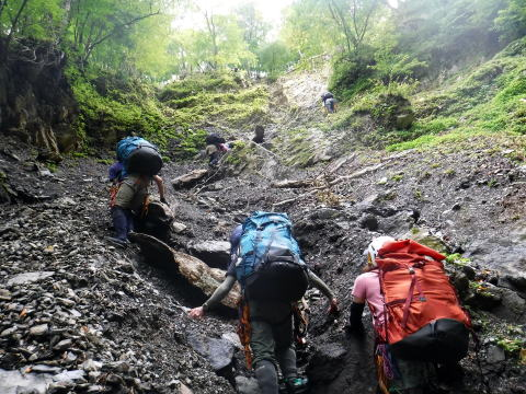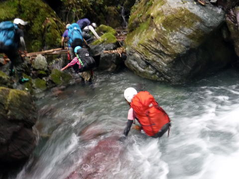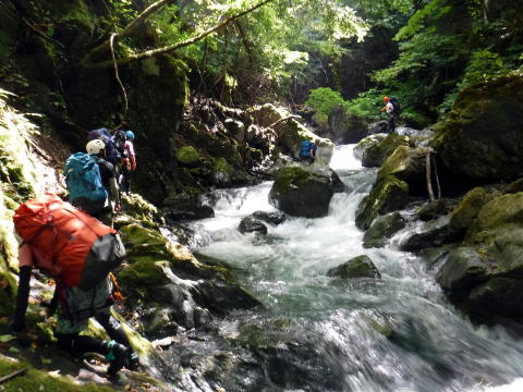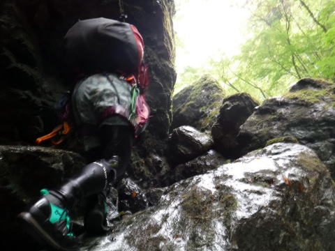 入渓すると沢は巨大アクティブティ。わくわくどきどき。幸い天気は少し回復し、頭の上まで木々の緑が覆っています。