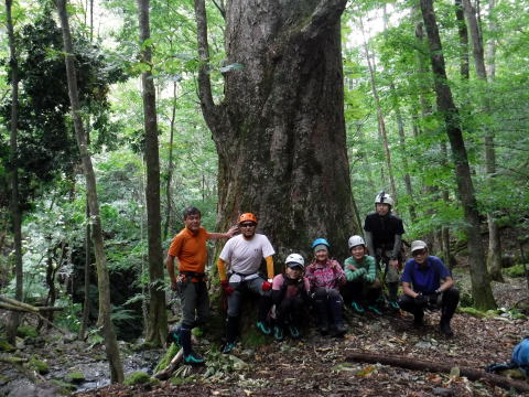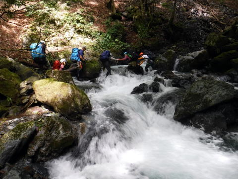 みんなで写真を撮って、さぁ頑張ろうっと気合いを入れて沢に入ります。今日は長いよ、頑張れるかな?光がピカピカ、風がそよそよ気持ちいい。あの木は何かな?サワグルミ?緑がきれい。緑を透かすように陽の光がはいってくる。この緑って世界で一番きれいな緑だと思う。これを見たくて沢に来るんだなぁ。秋の紅葉もいいよなぁ。もう一度来たい。冷たい水の中を歩かない沢に行こう。うーん、楽しみ。