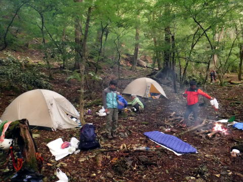 テン場についたら、薪拾い。焚火が一番楽しい。なんにもしないで一日焚火を見ていてもいいんだけどなぁ。