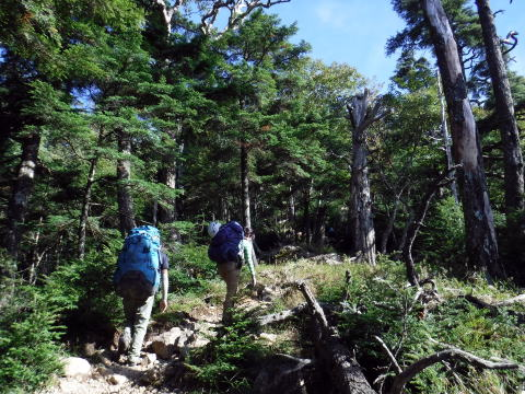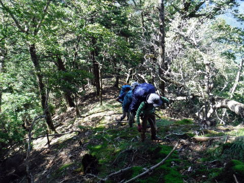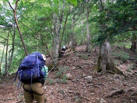 あとはきつい山登り。よいしょよいしょ。汗が噴き出してくる。山の木々が癒してくれます。みんな強いなぁ。ちょっと待ってよ。原始のままの森が残る、こんな尾根が大好き。植林されちゃうと山はさみしくなっちゃうから。