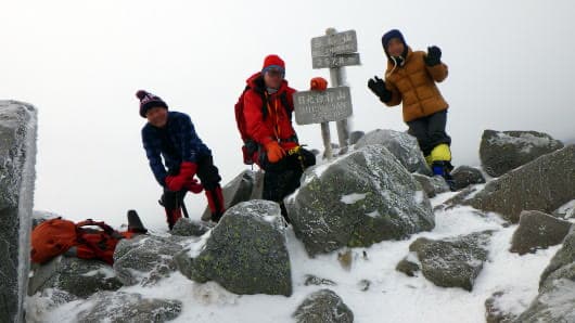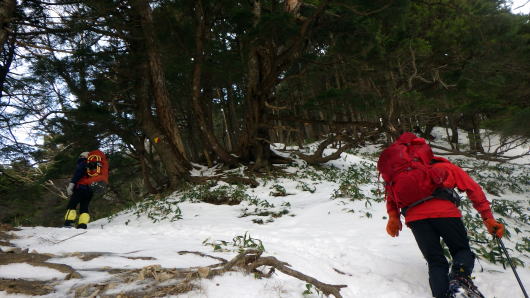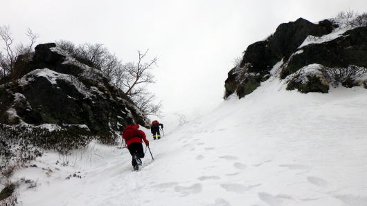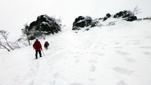 湯元から、スキー上のゲレンデ横を登っていきました。段差のないきつい斜面、これが地味にきつかった・・・。