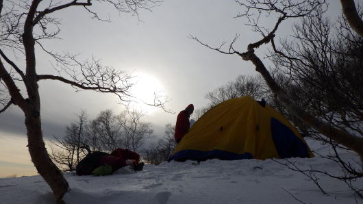 下山中にすれ違ったお兄さんが、途中に大きなテントがあって珍しいから写真撮っちゃいましたとのこと。それは、うちのパーティのもの。そういえば、他にはテント泊している様子はなく、珍しいんでしょうかね。雪山のテントは、寒いけど、とても楽しいのに。