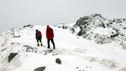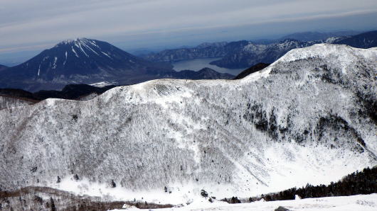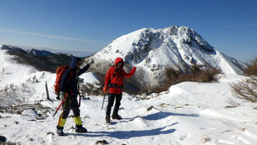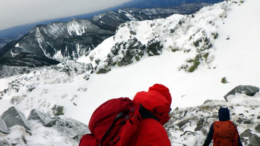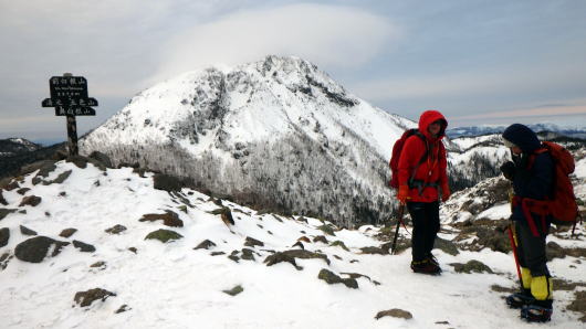 奥白根を眺めると、グレーがかった色合いにそれはそれで何だかすごく威厳を感じ、期待も高まります。そして、五色沼避難小屋のあたりから見上げると、すごい急斜面。あんなところを登るのか・・・と心配にもなりましたが、強者たちのトレースは最強。あまり苦労することもなく登ることができました。