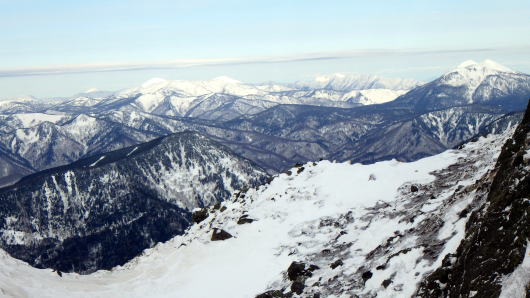 振り返ると男体山と中禅寺湖、前白根から白根隠へつながる尾根、そしてはるか目の下に避難小屋の谷底、高度感があります