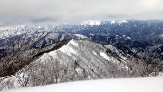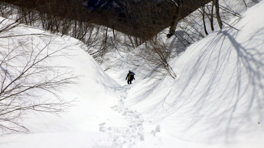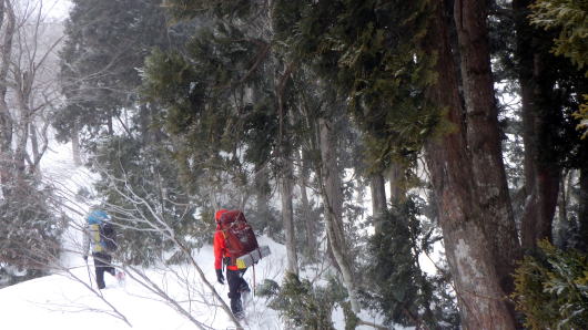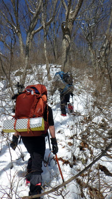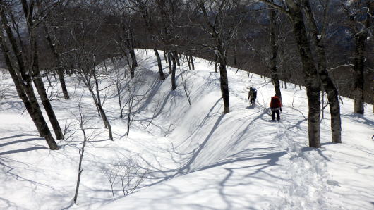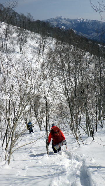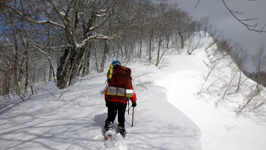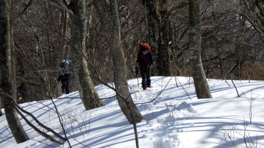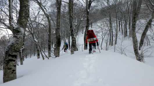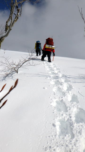 雪が締まってないし重たいし、藪は途切れないし、なかなか進めません。