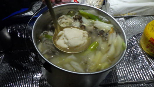 朝食はおしるこやパン、ソーセージなどを食べて明るくなった6:30に出発。