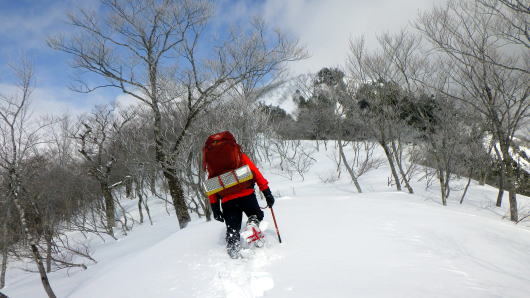 稜線に出ても雪のコンディションは変わらず、一歩一歩を踏み締めて歩きます。山頂は遠いなー