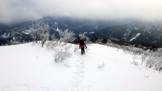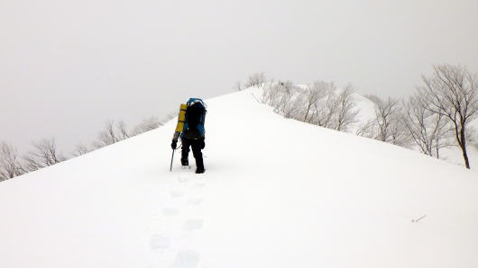 昨日と違いガスがでて少し寒いです。藪は減らないし雪は昨日より深いし、、相変わらず簡単には進ませてくれません。