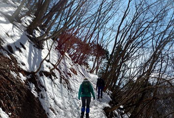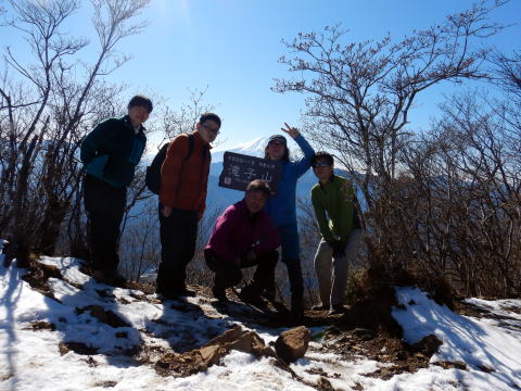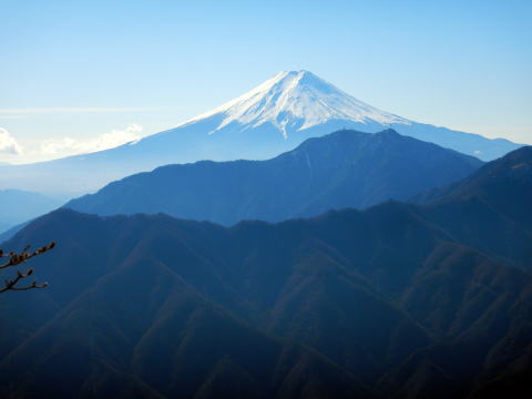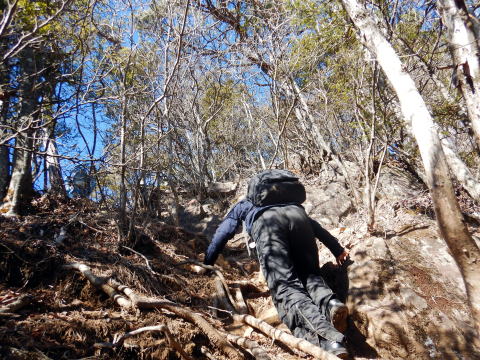 背後に富士山の頭が見え始める辺りから、尾根は岩まじりに急になる。しっかりしたスタンスがあるので難しくはないけど、高度感はありました。今日、初めて登山の若者も、滑り易そうな運動靴で頑張って登りました。