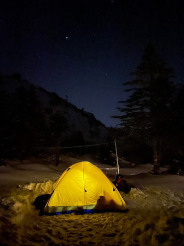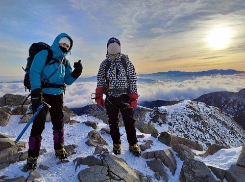 2日目、日の出前に出発し、朝焼けする橙色の山景色を眺めながら、天狗岳を目指し登頂。