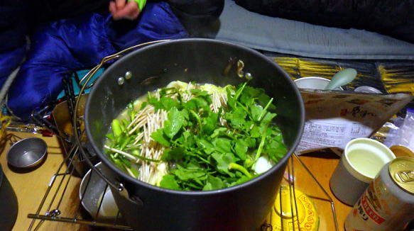 夜は、満天の星空。食担リーダーワラシーさんが、ウタコさん直伝のキリタンポ鍋を作ってくれました。激旨!