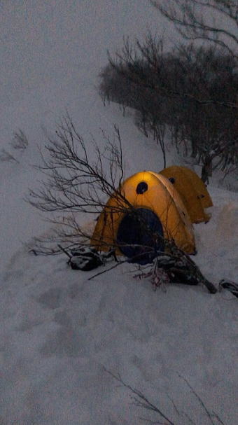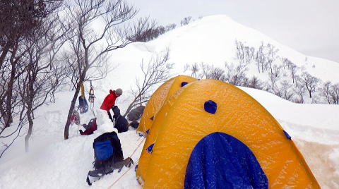 夕方から低気圧が来ることからタカマタギには行かず、棒立山とタカマタギのコルでテント張ることに決めた。