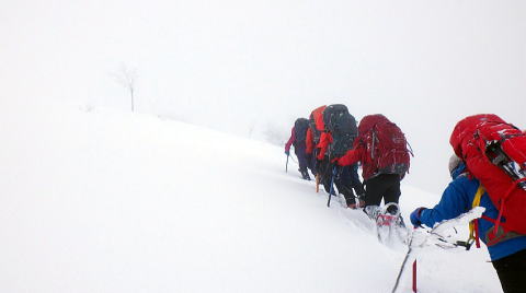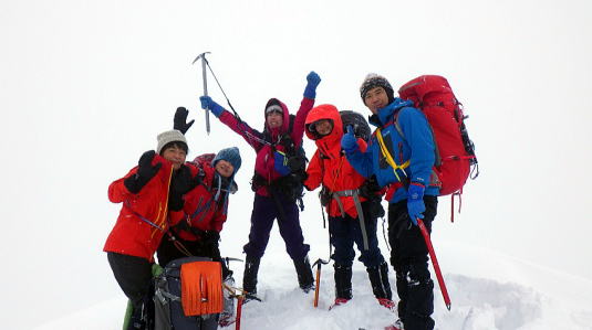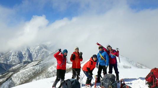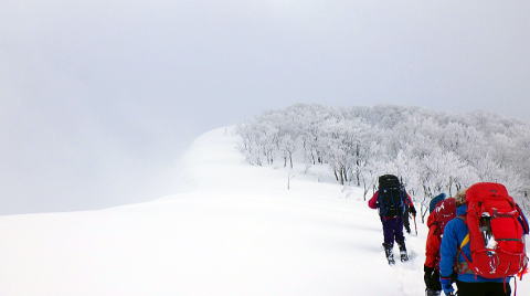 タカマタギから日白山までは2つピークがあり、地図よりも思ったより急なところもあり、ラッセルが大変なところもありました。雪庇にも気をつけながら進みました。ただ、だんだんと天候が回復していきます。