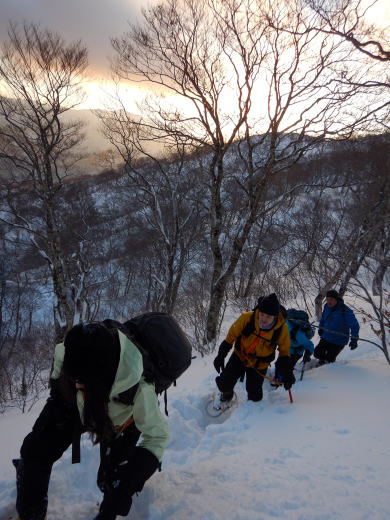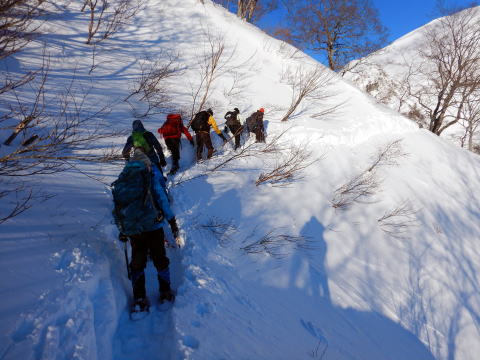 昨日習った通り、ピッケルを山側に持ち替えながら、先導隊に続いて雪道を進んでいくと、コレコレ、これがしたかったんだなーと、改めて実感。