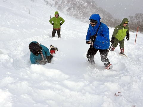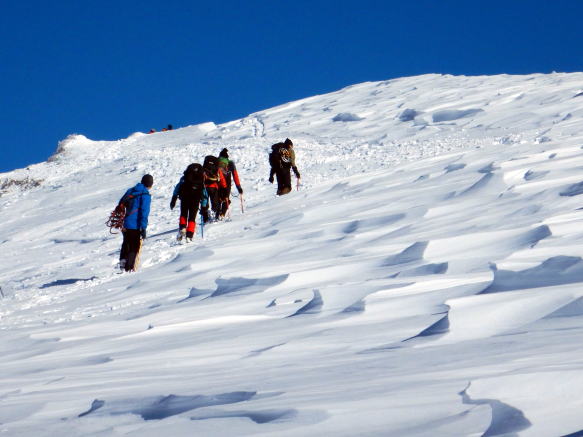 アイゼンを使っての滑落停止の訓練や、トラバース、耐風姿勢を教わる。