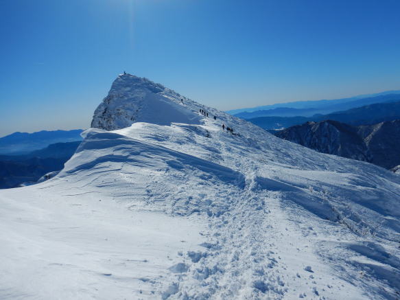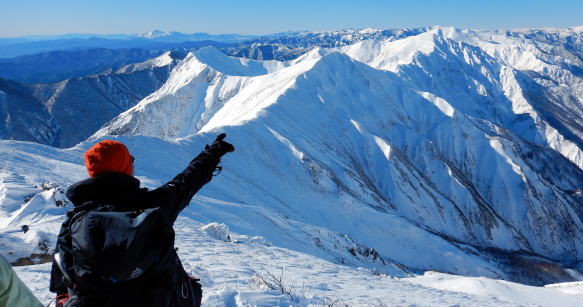 谷川岳は冬でもこんなに人が多いのかと驚くと共に、我々が築いたトレースを辿って、何百人(?)もの岳人が登っていくのを見ると、ちょっと気分が良いものだ。