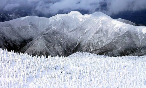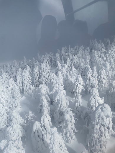 すると時折ガスの隙間から空が見え始め、ついに山々と樹氷の森があらわになった。