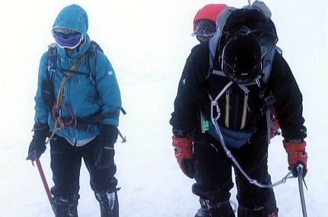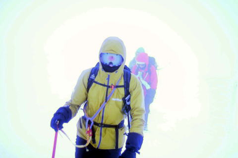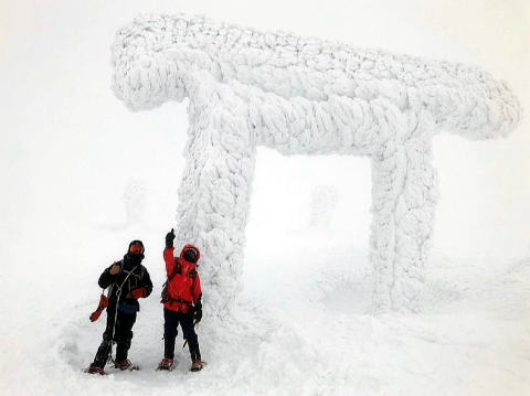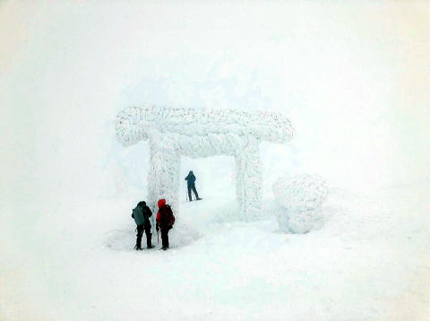 熊野岳に着き真っ白な視界に目を凝らすと、お化けみたいな氷の鳥居と社が浮かび上がり驚いた。
