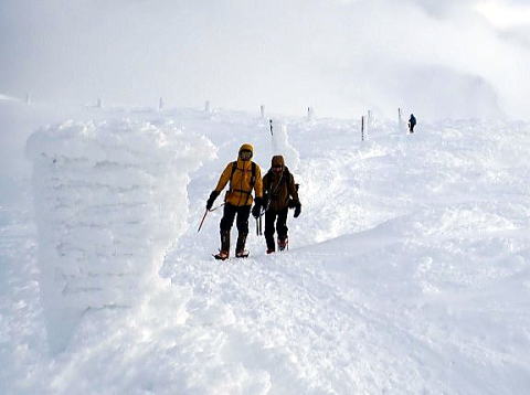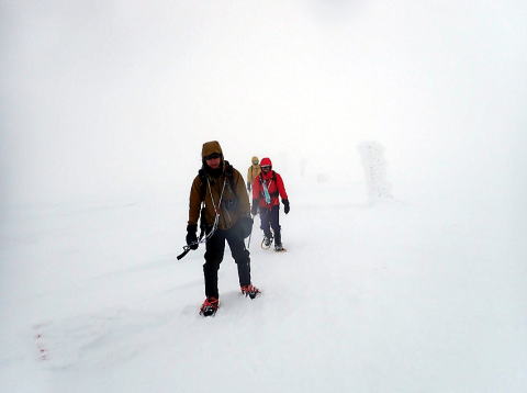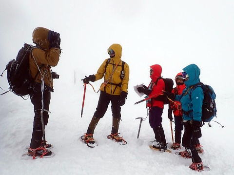 蔵王山へはホワイトアウトの中トレースもなかったため避難小屋を経由するルートに変更した。