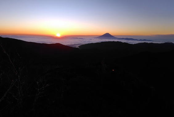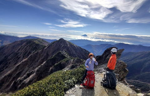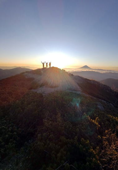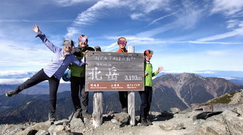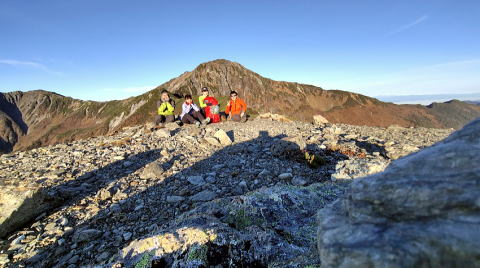 何度も見ているはずの富士山もご来光も今回はまた格別、みんなで息をのみ声を上げました。ようやく姿を見せた北岳が、間ノ岳や農鳥岳とともに威風堂々です。