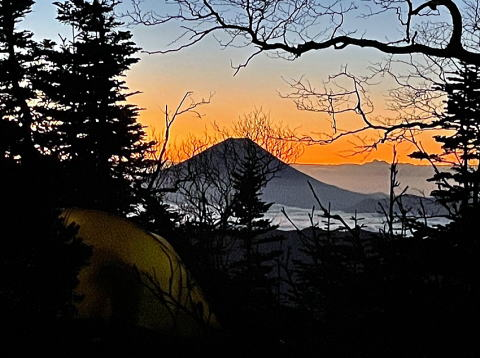 ようやく枝尾根に乗って少し傾斜が緩んだ先で池山避難小屋、広い草地があり不思議なところ。そこから先もしっかり登りが続きましたが、バコさんが音頭を取って食べ物の話題で気を紛らわせてくれました。16時少し前にようやく樹林帯が薄れてハイマツ帯に近づきました。樹林帯内でなかなか適地が見つからず、ちょっと狭い場所になんとか設営。ユコサイさんの謎肉カレー(美味)とハッシュポテト(おなかにたまる旨)、少なめのお酒で体を温め、20時くらいには、ちょっと傾きのある今日の我が家で眠りにつきました。この日に会った他の登山者は0人でした。