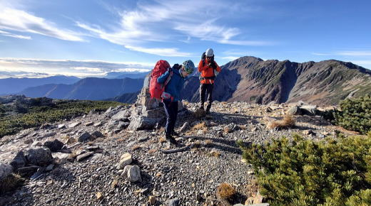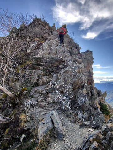 ハイマツ帯をプチ藪漕ぎで歩いたりして、今回の核心部である八本歯に8時過ぎから差し掛かりました。ヘルメットを着用。それなりの岩場・梯子があったりやせ尾根通過がありますが、メンバーを怯ませるほどではありません。とはいえ厳冬期登山の下見でもある今回、これが雪斜面だったらどうやって通過するのかと言葉を交わしつつ丁寧に進みました。また、厳冬期は飛ばされるほどの強風が吹くらしいですが、なるほど、この時期でも冷たい風が吹きつけます。厳冬期挑戦にはまだ多くが不足しているようです。