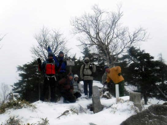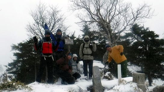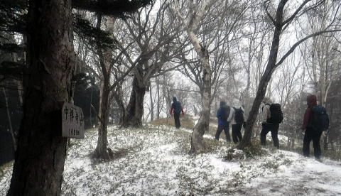 (※社山到着、風と吹き付ける雪が寒いので、樹林の中に入ってしばらく休みました。おおっみんな、チェーンスパイクを持っているのかい。)