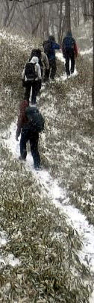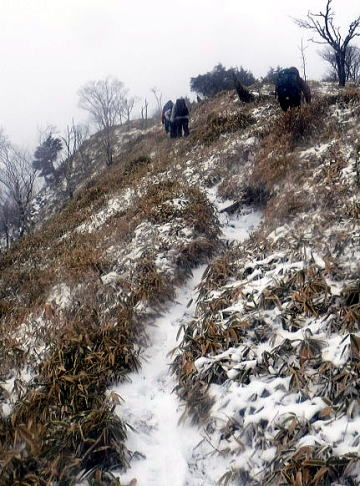 (※社山から阿世潟峠に戻ります。スパイクを着けていないと滑る。なんども尻もち、笹の斜面には落ちないようにしよう。)