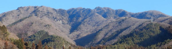 ※大月吉久保から見る滝子山。今日登る南稜は、右端の送電鉄塔がある尾根、中央に向かって緩やかに登って最後が急になります。