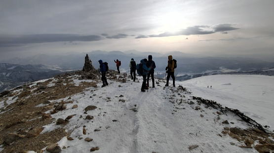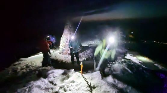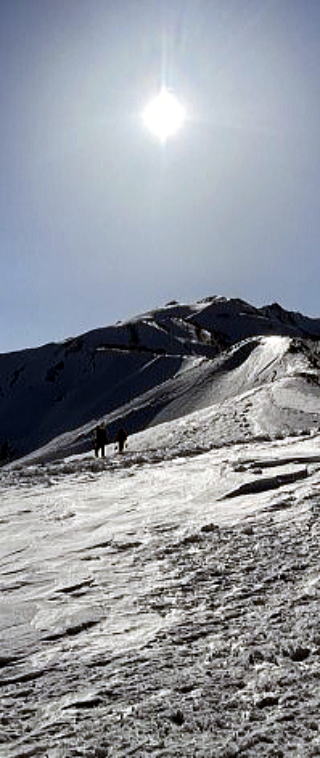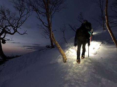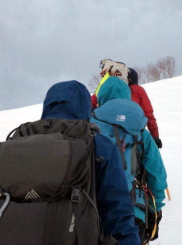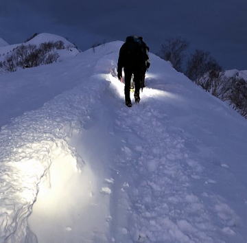 細尾根では往路にもまして風の波状攻撃をうけました。アオボーさんは雪山で初めて怖さを少し感じたそうですが傍で見る限り着実の足運び。ナッコーさんは(緊張感はあっても)怖くはなかったそうです。お二人ともなんとも頼もしい新人です。
