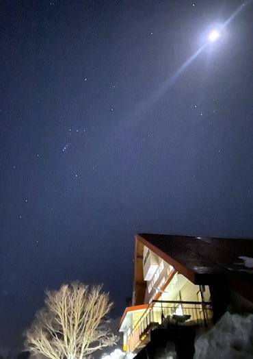 お布団とウォシュレット、テント泊にはもう戻れない(笑)、外ではオリオン座と月が綺麗でした。