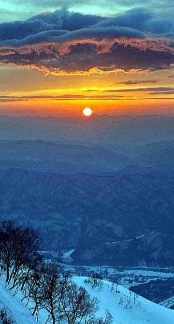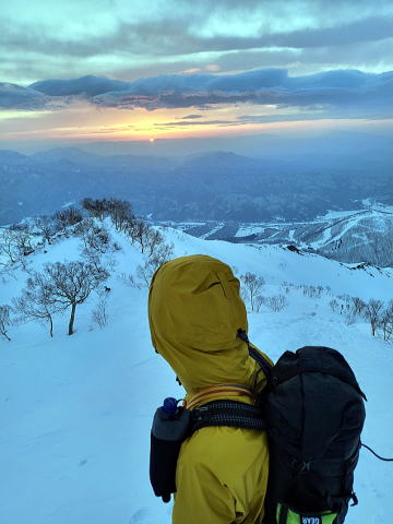 暗い中をヘッドライトで歩き続けるも、振り返るたびに黒から紫、青、オレンジと変化する東の空に歓声をあげならの撮影タイム、それにしても霞と雲に飾られた朝焼けが美しかった。