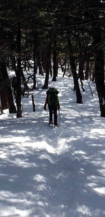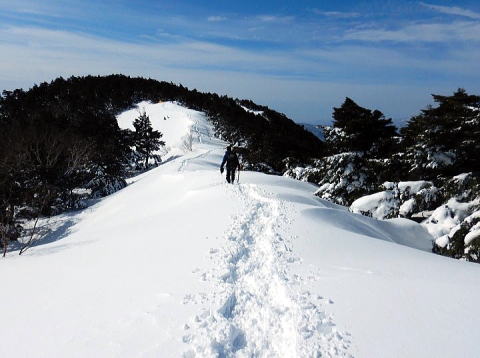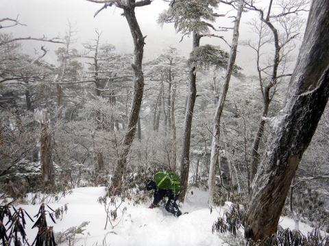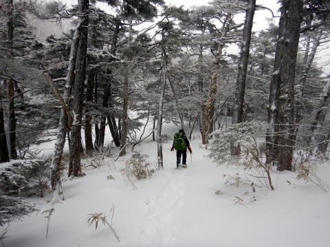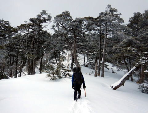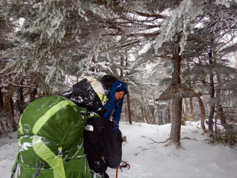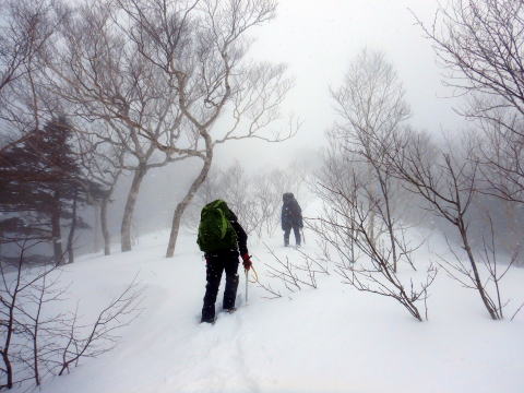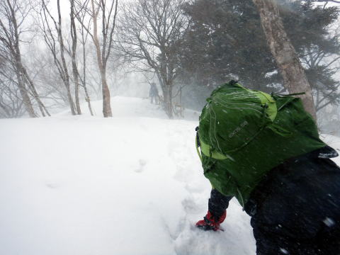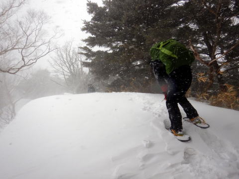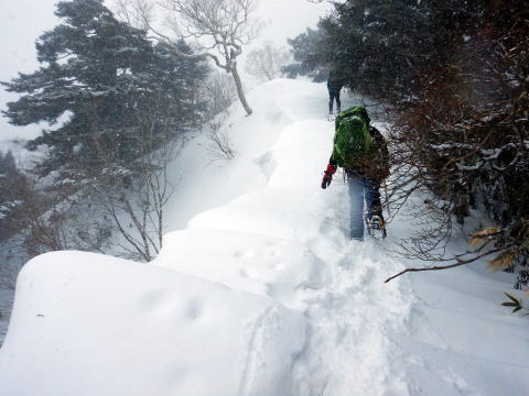 ※サル山辺りでチラチラ降り出した雪が、山藤山の登りにかかった頃から本降りになる。山藤山を越えて河下山の登りの急斜面、雪と風がきつい。