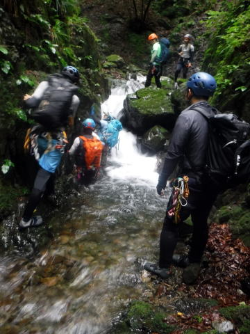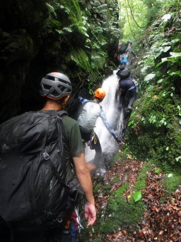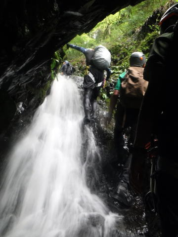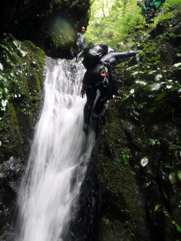 それもつかの間、2mほどの滝で少し深くなる滝つぼへの入水を避け、壁に張り付きながら横移動という見たことのないムーブが登場。