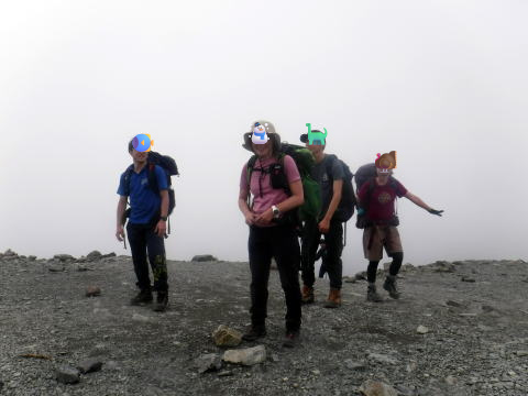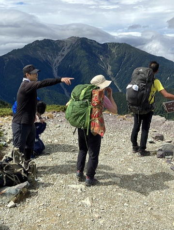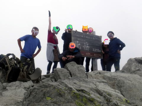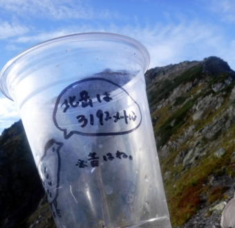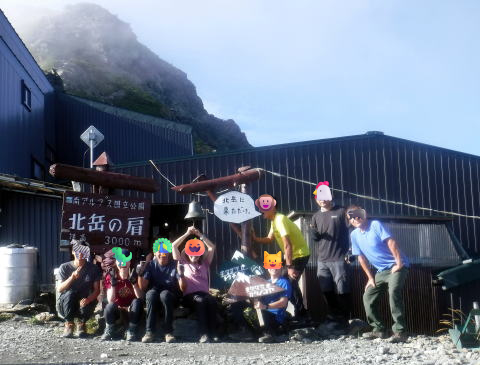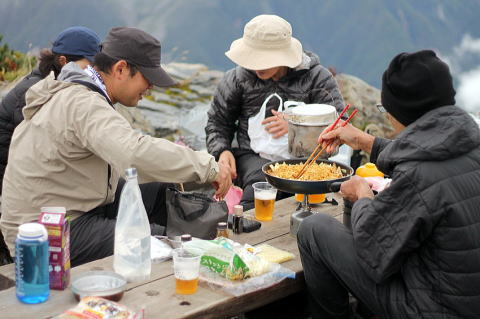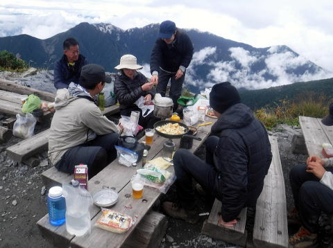 北岳山頂到着 あいにく雲に隠れてしまっていたが、皆でここにこられたことに感動 そこから小屋に戻り美味しい夕食をいだだいた 焼きそば、ポテトサラダ、あつあつの豚汁 みなさんの人柄が出るほっこりするご飯を食べて心も体も温まった