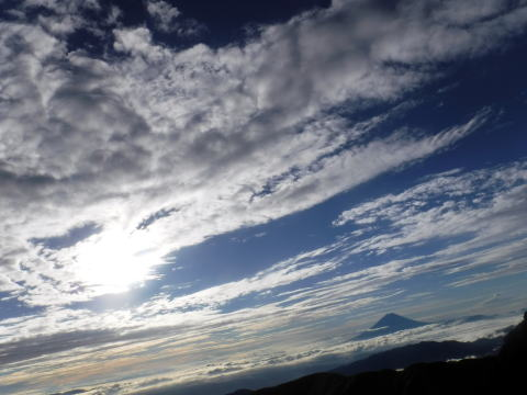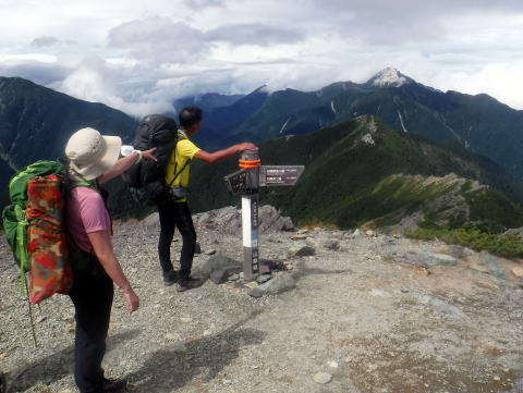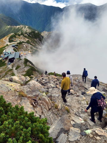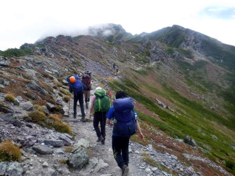 あと少しか… それからは稜線歩き甲斐駒ヶ岳、仙丈ヶ岳、富士山が雲の間から見えた こんなに近くに見えるんだ〜 それから肩の小屋を目指してラストスパート 足が棒になってしまいそうだった。