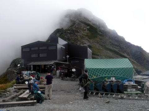 ((※北岳にガスがかかって、その手前に肩ノ小屋が見えます。))