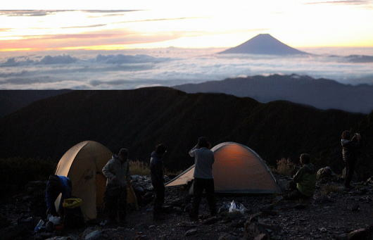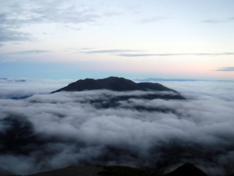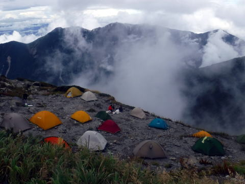 ((※隣テントの若手組はゲームをしていたみたいだけど、即寝てしまう。明日の朝、天気が良ければ山頂で日の出と影北岳を見ようということにしていたが、3時頃に起きた時はまだ雨粒の音がしていた。